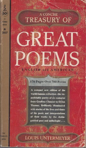 The cover has been worn off the book and I have many other books about the poets and their lives and styles, but Untermeyer's masterpiece has remained by my side and will stay with me until the end. It was an education as well as a treasury, and it turned my small town head in a direction that would offer me solace and pleasure for the days of my life. One in a million, I expect that everyone has a special book that changed their life, but this is the one for me. Oh, and it is a great book to introduce any reader to the rich world of English speaking poetry. The short biographies and histories are great supplements to the poetry and the book is a springboard to greater reading....buy it...for a penny or a for hundreds of pennies, it is worth it!