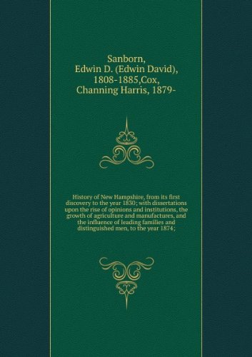 HIGH QUALITY FACSIMILE REPRODUCTION: Sanborn, Edwin D. (Edwin David): History Of New Hampshire, From Its First Discovery To The Year 1830; With Dissertations Upon The Rise Of Opinions And Institutions, The Growth Of Agriculture And Manufactures, And The Influence Of Leading Families And Distinguished Men, To The Year 1874; : Facsimile: Originally published by Manchester, N.H. : J.B. Clarke in 1875. Book will be printed in black and white, with grayscale images. Book will be 6 inches wide by 9 inches tall and soft cover bound. Any foldouts will be scaled to page size. If the book is larger than 1000 pages, it will be printed and bound in two parts. Due to the age of the original titles, we cannot be held responsible for missing pages, faded, or cut off text.